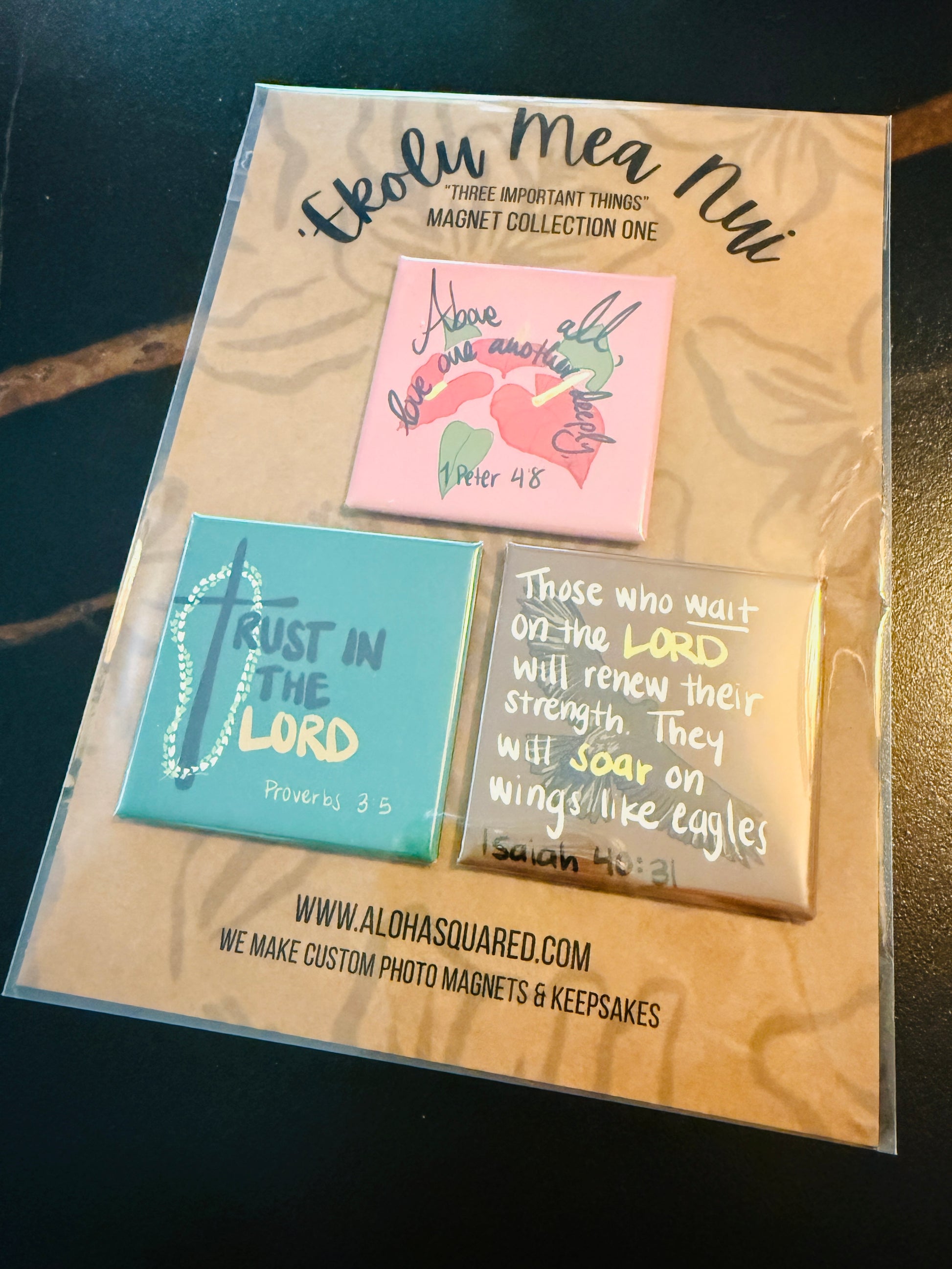 This collection was inspired by the old classic Hawaiian hymn, 'Ekolu Mea Nui and translates to "three important things": faith, hope, and love(aloha). Featuring hand-drawn designs by 'Ena. May these scriptures and keepsakes remind you of things above and how much our Heavenly Father loves you.